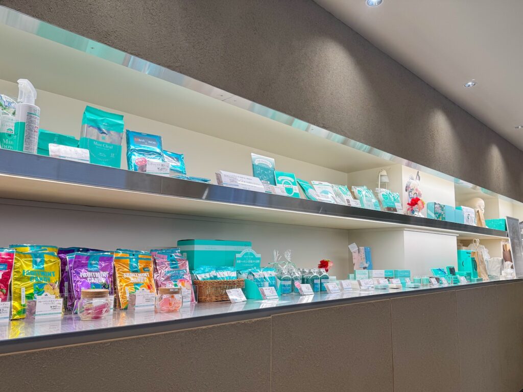 ペパーミントティーやキャンディーなど食品はもちろん、石けんや保湿クリームなどのコスメ製品まで薄荷を使用した製品がたくさん並んでいます。