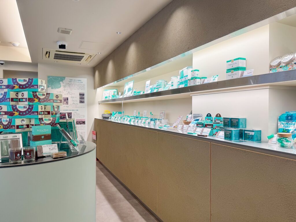 2階のイートインスペースは北見ハッカさんのアイテムも充実!